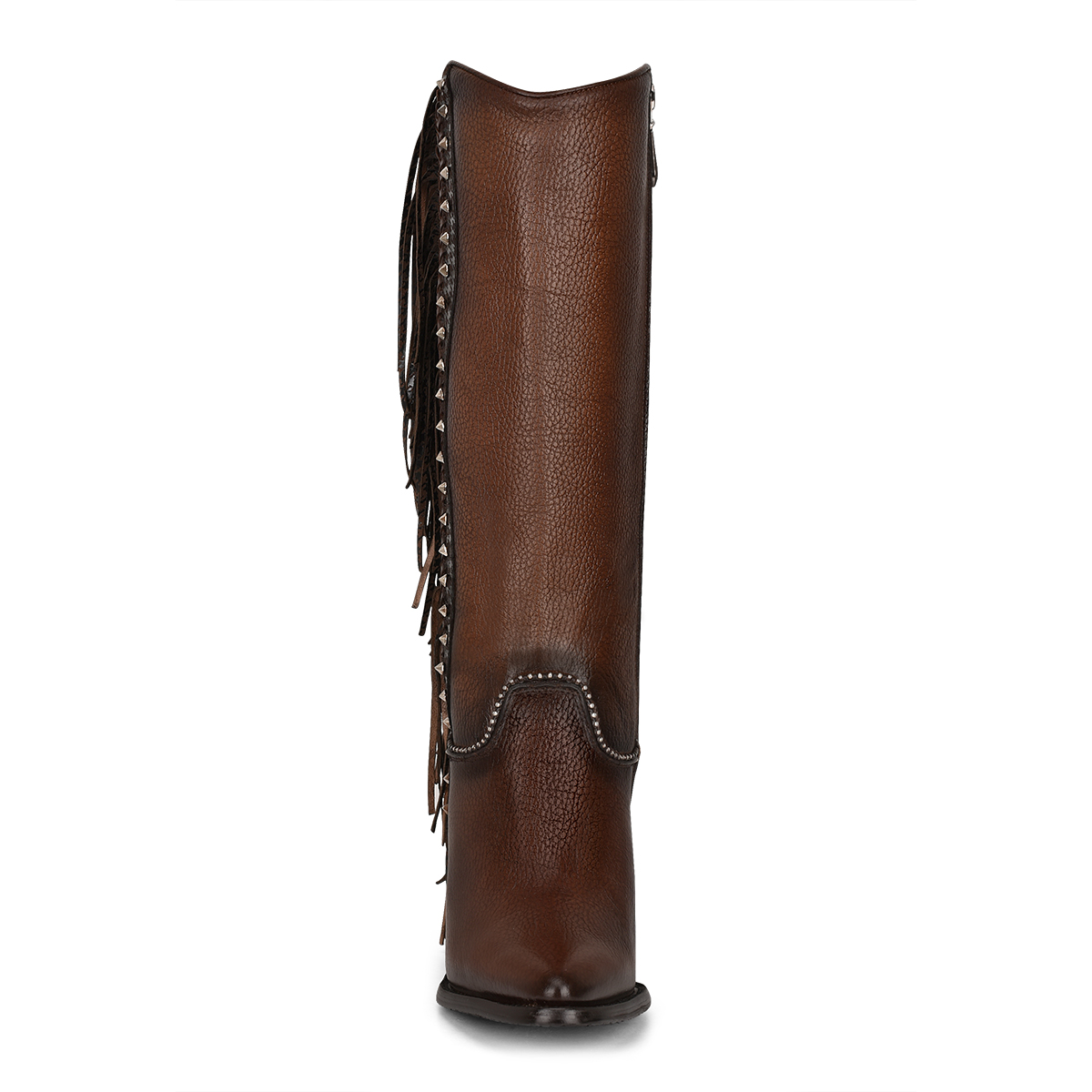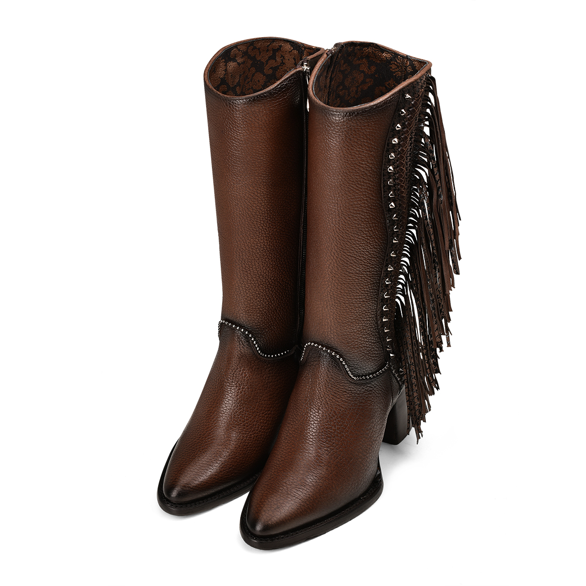Bota alta para dama en piel de bovino. Presenta aplicaciones metálicas, aplicación de flecos con sutil estampado tipo houndstooth y trenzado artesanal. Con acabado pintado a mano y aplicación nobucada en la parte trasera. Ajustada con cierre interno. Con suela con injerto de TR.